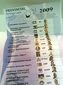 | Alliance démocratique | Helen Zille | 2 945 829 | 16,66 | +4,29 | −3 | ±0 | 47 | 67 | +20 | |