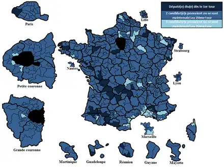 L'élection des députés à l'Assemblée nationale se déroule selon un mode de scrutin uninominal majoritaire à deux tours[13] dans chacune des 577 circonscriptions[14]. Pour être élu dès le premier tour, le candidat doit réunir la majorité absolue des suffrages exprimés et un nombre de voix au moins égal au quart des électeurs inscrits[15]. Si aucun des candidats ne satisfait ces conditions, un second tour est organisé, pour lequel ne peuvent se maintenir que les candidats du premier tour ayant réuni au moins 12,5 % des électeurs inscrits. Si cette exigence est satisfaite par aucun ou un seul candidat, les deux candidats ayant recueilli le plus grand nombre de suffrages peuvent se présenter à ce second tour[16].