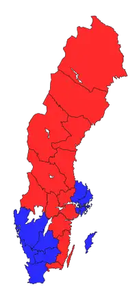 | Comté de Dalécarlie | 40,34 | 5 | 21,06 | 3 | 10,76 | 1 | 5,13 | 1 | 5,42 | 1 | 6,65 | 1 | 4,35 | 1 | 6,28 | 0 | 80,48 | 13 |