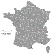 | Résultats dans les villes de France métropolitaine de plus de 10 000 habitants, selon les nuances définies par le ministère de l'Intérieur[1]. | ||||||||||||||