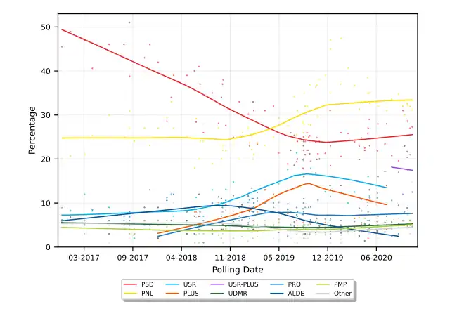 | Date | Institut | Echantillon | PSD | PNL | USR | PLUS | UDMR/RMDSZ | PRO | ALDE | PMP | Autres | Avance |