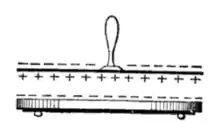 Un électrophore consiste en une plaque diélectrique, laquelle était originellement un « gâteau » de matière résineuse comme de la poix ou de la cire (du plastique est utilisé dans les versions modernes), ainsi qu'une plaque de métal avec un manche isolant[7]. D'abord, la plaque diélectrique est chargée via l'effet triboélectrique en la frottant avec de la fourrure ou un tissu. Pour cette discussion, imaginez que le diélectrique gagne de la charge négative par frottement, comme dans l'illustration ci-dessous. Ensuite, la plaque métallique est placée sur la plaque diélectrique. Le diélectrique ne transfère pas une fraction importante de sa charge de surface sur le métal parce que le contact microscopique est faible. En revanche, le champ électrostatique du diélectrique chargé fait que les charges de la plaque métallique se séparent. Il développe deux régions de charge : les charges positives de la plaque sont attirées par le côté faisant face vers le bas (vers le diélectrique), le chargeant positivement, tandis que les charges négatives sont repoussées vers le côté vers le haut, le chargeant négativement, alors que la plaque reste électriquement neutre dans son ensemble. Ensuite, le côté face vers le haut est momentanément mis à la terre (ce qui peut être fait par le toucher du doigt), vidangeant la charge négative. Enfin, la plaque de métal, désormais porteuse d'un seul signe de charge (positive dans notre exemple), est levée[2].