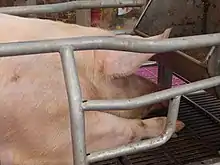 Les truies reproductrices, près d'un million en France, sont placées une grande partie de leur vie dans des cages individuelles trop étroites pour leur permettre de se retourner[29].