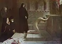 Mort d'Élisabeth de Hongrie. Enluminure des Grandes Chroniques de France de Charles V, vers 1370-1379. BnF, département des manuscrits, ms. Français 2813, fo 269 vo. | |