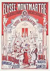 Ouverte en 1807[1],[2], l'Élysée-Montmartre est à ses débuts une salle de bal. On y pratique un nouveau style de danse : le quadrille naturaliste, ou cancan, exécuté notamment par Valentin le Désossé ou Grille d'Égout. L'établissement se compose alors de trois corps de bâtiment et d'un vaste jardin. Émile Zola décrit sa façade dans son roman L'Assommoir.