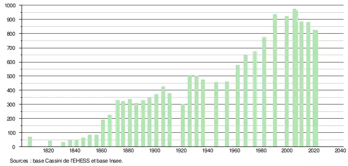 L'évolution du nombre d'habitants est connue à travers les recensements de la population effectués dans la commune depuis 1806. Pour les communes de moins de 10 000 habitants, une enquête de recensement portant sur toute la population est réalisée tous les cinq ans, les populations légales des années intermédiaires étant quant à elles estimées par interpolation ou extrapolation[36]. Pour la commune, le premier recensement exhaustif entrant dans le cadre du nouveau dispositif a été réalisé en 2005[37].