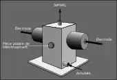 Sous son aspect industriel pour la marine, l’arc est soufflé par un électroaimant « M », ceci dans le but de l’allonger pour obtenir une meilleure stabilité ; la cathode (–) est en carbone, l’anode (+) en cuivre et refroidie par une circulation d’eau ; l’arc jaillit dans une atmosphère de vapeur d’alcool ; la tension appliquée est de l’ordre de 600 volts, la fréquence obtenue de 500 kHz, avec une puissance de l’ordre de plusieurs kilowatts.