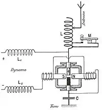 Si on place en dérivation sur un arc électrique « A » (jaillissant entre deux électrodes reliées à une source continue) un condensateur suivie d’une bobine, on constate que ce circuit résonant « LC » est le siège d’oscillations entretenues. Les oscillations entretenues sont couplées à l'antenne radioélectrique qui permet d'émettre l'onde radio. Ce matériel est simple et robuste, avec un rendement d'environ 40 %.