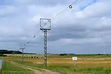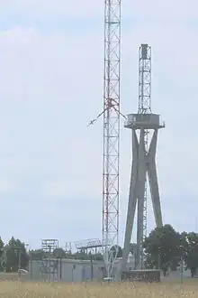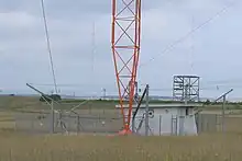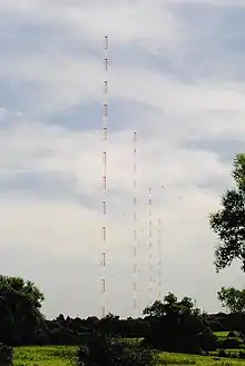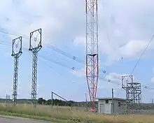 Le système principal (photo 5a), directionnel, est constitué par quatre pylônes en acier à section constante triangulaire, à 3 mètres de côté, soutenues par des haubans et dont les hauteurs sont comprises entre 270 et de 282 mètres (entre-axes : 350 mètres). Elles sont visibles à plusieurs kilomètres et signalées la nuit par un dispositif lumineux. La photo 6 montre les différents dispositifs de couplage avec l'antenne, divers dispositifs de protection (la foudre est notamment un problème classique, parfois responsable de coupures) ainsi que la cabine d'antenne renfermant des dispositifs de mesure. La base du pylône est isolée électriquement du sol. La prise de terre comprend des fils de cuivre disposés en rayon à partir des pylônes, de grande longueur (290 km au total), la bonne conductivité permettant de diminuer la perte d'énergie au niveau du sol.
