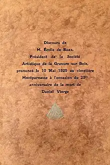 - Émile de Ruaz, « Discours de M. Émile de Ruaz, Président de la Société Artistique de la Gravure sur bois, prononcé le 10 mai 1929 au cimetière Montparnasse à l'occasion du 25ème anniversaire de la mort de Daniel Vierge », sur bibliotheques-specialisees.paris.fr, Paris, Société artistique de la gravure sur bois, (consulté le ).