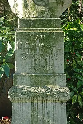 En , un monument portant son buste en bronze, œuvre du sculpteur belge Marnix d'Haveloose, est inauguré au Square de Meeûs par le bourgmestre Buyl d'Ixelles. Il est dérobé durant la Seconde Guerre mondiale. En 1948, un buste en marbre, œuvre du même Marnix d'Haveloose, est réinauguré par le bourgmestre Flagey. Le , les autorités communales annoncent toutefois que celui-ci serait déplacé sous peu au Musée royal de l'Afrique centrale[9] en vue d'être « contextualisé ». Le , le buste du général Storms est aspergé de peinture rouge[10],[11]. Le 30 juin 2022, le buste est retiré sans permis d'urbanisme sur ordre du bourgmestre Ecolo d'Ixelles[12],[13],[14] .
