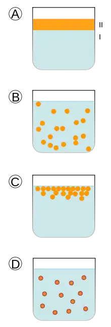 1. Phénomènes migratoires : par lesquels la différence de densité entre la phase continue et dispersée entraînent une séparation de phase gravitationnelle : pour les émulsions, on a du crémage (en) (phase dispersée moins dense que la phase continue poussant celle-ci à migrer vers le haut) ou de la sédimentation. Ces phénomènes sont réversibles ;
