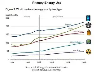Les trois dernières lignes regroupent les énergies renouvelables (EnR) ; au total, elles sont passées de 12,2 % des ressources mondiales en 1973 à 13,5 % en 2015. Les conventions utilisées par les statistiques de l'Agence internationale de l'énergie (AIE) et d'Eurostat, contrairement à celles de l'Energy Information Administration (EIA) américaine (une agence du département de l'Énergie des États-Unis), minorent la part des énergies renouvelables électriques. Avec des conventions conformes aux ratios réels de substitution entre énergies fossiles et électricité, telles que celles de l'EIA, on obtient environ 6,9 % pour l'hydroélectricité et 3,5 % pour les autres EnR, hors biomasse, ce qui porte la part des énergies renouvelables à 20,6 % en 2013.