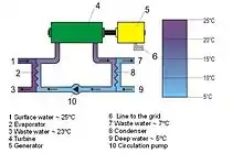 Cette différence de température peut être exploitée par une machine thermique. Cette dernière ayant besoin d'une source froide et d'une source chaude pour produire de l'énergie, utilise respectivement l'eau venant des profondeurs et l'eau de surface comme sources.