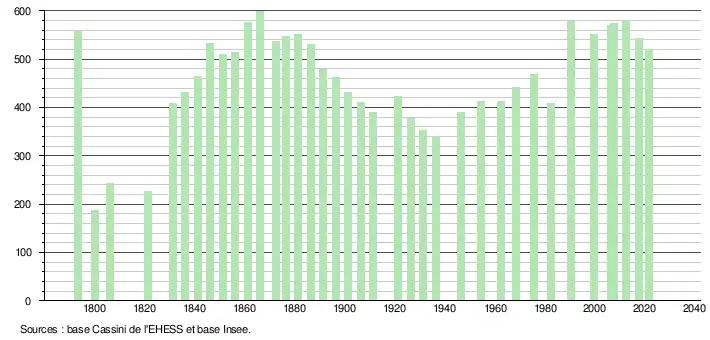 L'évolution du nombre d'habitants est connue à travers les recensements de la population effectués dans la commune depuis 1793. Pour les communes de moins de 10 000 habitants, une enquête de recensement portant sur toute la population est réalisée tous les cinq ans, les populations légales des années intermédiaires étant quant à elles estimées par interpolation ou extrapolation[24]. Pour la commune, le premier recensement exhaustif entrant dans le cadre du nouveau dispositif a été réalisé en 2007[25].