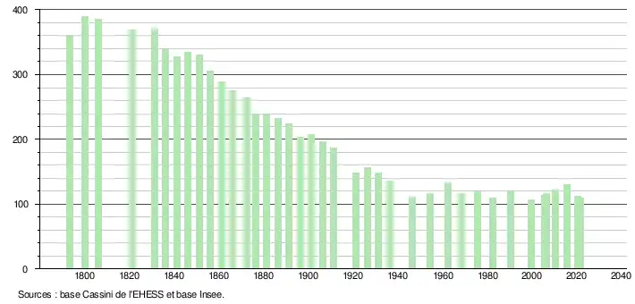 L'évolution du nombre d'habitants est connue à travers les recensements de la population effectués dans la commune depuis 1793. Pour les communes de moins de 10 000 habitants, une enquête de recensement portant sur toute la population est réalisée tous les cinq ans, les populations légales des années intermédiaires étant quant à elles estimées par interpolation ou extrapolation[25]. Pour la commune, le premier recensement exhaustif entrant dans le cadre du nouveau dispositif a été réalisé en 2005[26].