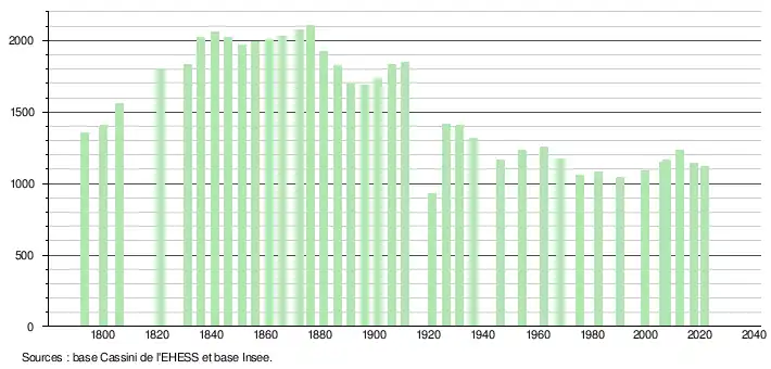 L'évolution du nombre d'habitants est connue à travers les recensements de la population effectués dans la commune depuis 1793. Pour les communes de moins de 10 000 habitants, une enquête de recensement portant sur toute la population est réalisée tous les cinq ans, les populations légales des années intermédiaires étant quant à elles estimées par interpolation ou extrapolation[29]. Pour la commune, le premier recensement exhaustif entrant dans le cadre du nouveau dispositif a été réalisé en 2007[30].
