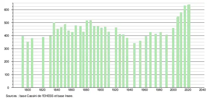 L'évolution du nombre d'habitants est connue à travers les recensements de la population effectués dans la commune depuis 1793. Pour les communes de moins de 10 000 habitants, une enquête de recensement portant sur toute la population est réalisée tous les cinq ans, les populations légales des années intermédiaires étant quant à elles estimées par interpolation ou extrapolation[17]. Pour la commune, le premier recensement exhaustif entrant dans le cadre du nouveau dispositif a été réalisé en 2005[18].