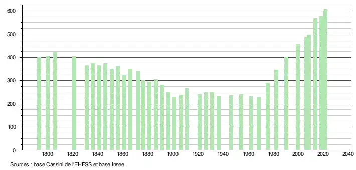 L'évolution du nombre d'habitants est connue à travers les recensements de la population effectués dans la commune depuis 1793. Pour les communes de moins de 10 000 habitants, une enquête de recensement portant sur toute la population est réalisée tous les cinq ans, les populations légales des années intermédiaires étant quant à elles estimées par interpolation ou extrapolation[20]. Pour la commune, le premier recensement exhaustif entrant dans le cadre du nouveau dispositif a été réalisé en 2008[21].