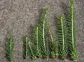 Les aiguilles, solitaires, sont disposées en brosse sur le rameau. Elles sont piquantes et leur section transversale est quadrangulaire. De couleur vert foncé sur toutes les faces, elles mesurent entre 15 et 25 mm de longueur[13]. Les stomates, blancs, sont uniformément répartis. Ces aiguilles sont persistantes et peuvent durer environ 5 à 7 ans[réf. nécessaire].