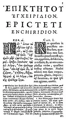 Marc Aurèle le cite ou l'évoque à plusieurs reprises[14]. Selon Pierre Hadot, les Pensées pour moi-même de Marc Aurèle seraient même les exercices pratiqués par Marc Aurèle en application des règles édictées par Épictète. Son exemple est également mis en exergue par Origène (IIIe siècle) comme modèle de martyr païen (épisode de la jambe cassée)[15]. Le philosophe néoplatonicien Simplicius (VIe siècle) est l'auteur d'un commentaire sur le Manuel d'Épictète. Dans l'enseignement néoplatonicien, le Manuel sert à acquérir certaines dispositions morales et à purifier l'âme avant d'exercer la philosophie proprement dite[16]. Épictète est cependant à peu près oublié durant le Moyen Âge même si des écrits apocryphes circulent parfois, comme le Dialogue d'Hadrien et d'Épictète, composé de 73 questions de l'empereur Hadrien répondues par Épictète. Cet ouvrage datant du IIe siècle ou IIIe siècle, jouit d'une grande notoriété dès le VIIIe siècle[17]. L'ouvrage d'Arrien n'est traduit en latin qu'à partir de 1453 et la première édition en grec paraît en 1535[18]. Une première traduction française[19] paraît en 1567 à Poitiers sous la plume d'André de Rivaudeau.