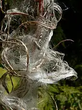 - Fruit : capsule linéaire rouge-brun pleine de semences, qui s'ouvre par des fentes au sommet. Elle porte de nombreuses graines brunes, environ 300 à 400 par fruit et 80 000 par plante. Les graines ont des poils soyeux qui facilitent l'anémochorie (dispersion par le vent) favorisant la colonisation rapide des milieux propices. Une fois établie, la plante se propage aussi largement par ses racines qui se rejoignent sous le sol.