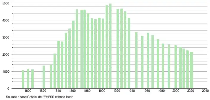 L'évolution du nombre d'habitants est connue à travers les recensements de la population effectués dans la commune depuis 1793. Pour les communes de moins de 10 000 habitants, une enquête de recensement portant sur toute la population est réalisée tous les cinq ans, les populations légales des années intermédiaires étant quant à elles estimées par interpolation ou extrapolation[37]. Pour la commune, le premier recensement exhaustif entrant dans le cadre du nouveau dispositif a été réalisé en 2005[38].