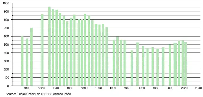 L'évolution du nombre d'habitants est connue à travers les recensements de la population effectués dans la commune depuis 1793. Pour les communes de moins de 10 000 habitants, une enquête de recensement portant sur toute la population est réalisée tous les cinq ans, les populations légales des années intermédiaires étant quant à elles estimées par interpolation ou extrapolation[29]. Pour la commune, le premier recensement exhaustif entrant dans le cadre du nouveau dispositif a été réalisé en 2007[30].