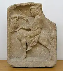 - sous la forme d'une jeune femme assise sur le dos d'une jument parfois accompagnée de son poulain (type équestre),