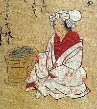 Vendeuse de truites (ayu) de Katsura (Katsurame), une des communautés de marchandes du Kyoto médiéval. Sanjūni-ban shokunin uta-awase emaki Concours poétique de trente-deux artisans »), fin XVe siècle.