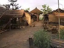 Dans le paysage rural, ce renforcement des communautés villageoises s'accompagna d'un mouvement de concentration de l'habitat, alors que l'habitat dispersé, fait de hameaux et maisons isolées, dominait auparavant. À partir du milieu du XIIIe siècle, ce phénomène toucha les villages du Kinai qui devinrent constitués de maisons agglomérées, et furent ceints par une motte, souvent précédée de douves. Les fouilles archéologiques du site de Kami Koma (préfecture de Kyoto, ancienne province de Yamashiro) ont ainsi révélé un petit village fortifié, comprenant en son centre un manoir qui devait appartenir à la famille guerrière dominant la communauté[85]. Certaines de ces agglomérations devinrent de véritables bourgs. Tout cela résultait de la volonté de faire face collectivement à l'insécurité croissante en se repliant dans un espace mieux contrôlé et sécurisé, peut-être aussi de l'importance croissante du travail en commun dans un contexte d'une intensification du travail agricole[86]. Le type de résidence traditionnel des ruraux était la maison à fosse. Les plus riches villageois occupaient de leur côté des fermes aux mûrs plâtrés et à toit de chaume supportées par des piliers, certaines pouvant mesurer une quarantaine de mètres de long, disposant d'un espace résidentiel, d'une salle d'eau, de cuisines et espaces de stockage, et à proximité étaient construites les résidences des serviteurs[87].