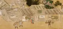 La période de Muromachi vit l'apparition d'un nouveau type d'agglomération, les « villes sous le château », jōkamachi[110]. Il s'agit comme leur nom l'indique de villes constituées autour de la résidence castrale d'un chef de clan guerrier. Ce type d'agglomération se développa durant l'époque Sengoku avec l'affirmation des entités politiques dirigées par des daimyō. Ichijōdani dans l'Echizen, capitale du clan Asakura, qui a fait l'objet de fouilles, en est l'exemple le plus anciennement connu, datant de la fin du XVe siècle[111]. Elle était organisée autour du château du clan, constituée de petites unités regroupant sans doute les vassaux par clan, et d'espaces commerciaux et artisanaux. Ses fouilles ont démontré qu'on pouvait retrouver dès cette époque dans une ville provinciale un urbanisme planifié et des éléments caractéristiques de la culture de la métropole (arts des jardins et du thé). Des villes castrales plus importantes se développèrent dans le courant du XVIe siècle : Odawara chez les Hōjō, Sunpu chez les Imagawa, Kōfu chez les Takeda, etc. Ce type d'agglomération se répandit ensuite durant l'époque d'Edo.