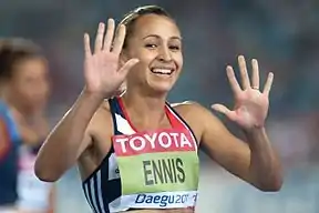 En 2003, aux mondiaux de Paris, la Suédoise Carolina Klüft devient la deuxième heptathlonienne après Jackie Joyner-Kersee à réaliser une performance supérieure à 7 000 pts lors d'un championnat du monde d'athlétisme. Elle remporte l'épreuve du saut en hauteur, du 200 m, du saut en longueur et du 800 m et totalise 7 001 pts à l'issue des deux journées de compétition[27]. Eunice Barber, qui s'impose dans l'épreuve du 100 m haies, remporte la médaille d'argent avec 6 755 pts, devançant Natallia Sazanovich, médaillée de bronze avec 6 524 pts. Denise Lewis termine à la 5e place.