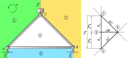 La structure est en équilibre. Cela signifie qu'à chaque nœud, la somme des forces est nulle. On peut donc tracer un polygone en mettant les forces bout à bout. Ce polygone des forces est encore appelé « polygone dynamique » ou simplement « le dynamique » ; dans l'exemple présent, il s'agit de triangles puisqu'il n'y a que trois forces à chaque nœud. Chaque force correspond à une poutre qui sépare deux zones, chaque angle du triangle peut donc être nommé avec le nom de la zone commune aux deux forces qui constituent les côtés adjacent à cet angle.