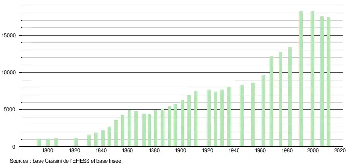 - Dans le tableau des recensements et le graphique, par convention dans Wikipédia, le principe a été retenu, pour les populations légales postérieures à 1999 de n’afficher dans le tableau des recensements et le graphique que les populations correspondant à l'année 2006, première population légale publiée calculée conformément aux concepts définis dans le décret no 2003-485 du 5 juin 2003, et les recensements espacés d’une période de cinq ans (2011, 2016, etc.) pour les communes de plus de 10 000 habitants, ainsi que la dernière population légale publiée par l’Insee.