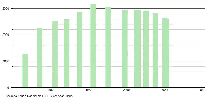 - Population municipale légale en vigueur au 1er janvier 2024, millésimée 2021, définie dans les limites territoriales en vigueur au 1er janvier 2023, date de référence statistique : 1er janvier 2021.