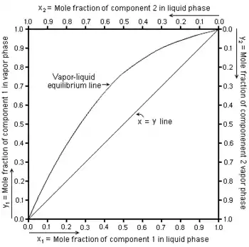Il est donc possible de représenter les quatre fractions molaires comme sur le diagramme donné en exemple sur la figure 1[3]. La diagonale entre les coins de coordonnées (, ) et (, ) est utilisée comme référence. Si la courbe d'équilibre croise la diagonale, le point d'intersection représente un azéotrope.