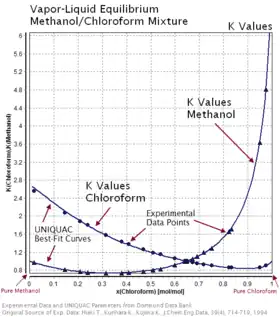 La tendance d'une espèce chimique donnée à se déplacer préférentiellement vers une phase (liquide ou gaz) est caractérisée par le coefficient de partage [6]. Il existe des données d'équilibre liquide-vapeur pour des mélanges de quatre composés ou plus, mais de tels diagrammes sont complexes à représenter. Pour de tels systèmes, ainsi que pour les mélanges binaires, l'équilibre est donc représenté par les valeurs de [2],[3] définies par :