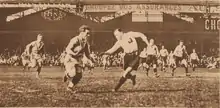 En 1933, l'Angleterre et l'Australie s'affrontent à Paris dans un cadre amical, il s'agit du premier match de rugby à XIII organisé sur le territoire français, il est remporté par l'Australie 63-13 devant près de 5 000 spectateurs[3]. À cette période, le rugby à XV français rencontre de nombreux problèmes où depuis 1931 son équipe nationale est exclue du tournoi des cinq nations en raison du professionnalisme de certains joueurs et du jeu violent pratiqué sur les terrains (cette suspension prendra fin le )[4]. Jean Galia, international quinziste et champion de boxe français, décide de mettre en place une équipe de France de rugby à XIII et d'effectuer une tournée de six matchs en Angleterre pendant l'année 1934 à la demande de la Rugby Football League (RFL) la fédération anglaise de rugby à XIII. Galia, radié de la Fédération française de rugby à XV en janvier 1933 pour non-respect contesté des règles de l'amateurisme et également pour ses mauvais rapports avec ces derniers, fait appel à 17 joueurs qui se trouvent également en délicatesse avec la fédération du XV, cette équipe appelée « Les Pionniers » (dont le capitanat et le management revient à Galia) dispute six matchs en mars 1934 en Angleterre avec un bilan de deux victoires et quatre défaites face à des équipes anglaises[5]. Ceci marque le coup d'envoi du rugby à XIII en France avant même qu'une fédération voit le jour.