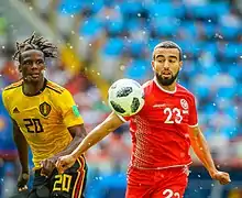 Le deuxième match contre la Belgique[258] se termine par une défaite tunisienne (2-5)[253]. À peine dix minutes après le début du match, le défi tardif de Syam Ben Youssef sur Eden Hazard est jugé, avec l'utilisation de l'assistance vidéo, juste à l'intérieur de la surface et il intervient pour marquer le penalty dans le coin inférieur gauche. Dix minutes plus tard, Dries Mertens prend possession de la balle juste à l'intérieur de la moitié de terrain tunisienne avant d'avancer et de passer le ballon à Romelu Lukaku. Lukaku tire ensuite une frappe basse sur Farouk Ben Mustapha dans le coin inférieur droit. Le coup franc de la gauche de Wahbi Khazri est accueilli par Dylan Bronn, qui décoche une tête devant Thibaut Courtois. Thomas Meunier trouve Lukaku à l'intérieur de la zone, qu'il écrase sur Ben Mustapha qui se précipite. La longue passe de Toby Alderweireld de la défense est prise sur la poitrine par Hazard, qui contourne ensuite Ben Mustapha pour frapper dans un filet vide. Michy Batshuayi rencontre le centre de Youri Tielemans au deuxième poteau d'une demi-volée contrôlée pour marquer le cinquième but de la Belgique. Khazri marque profondément dans le temps d'arrêt après un pivot dans la surface[259]. Pour la Tunisie, c'est la pire défaite de son histoire en coupe du monde[260].