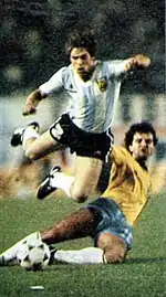En 1977, Cláudio Coutinho, un entraîneur novice mais aux idées bien arrêtées, est nommé sélectionneur. En réponse à l'échec de 1974, il entend apporter à la Seleção certains principes tactiques en vogue en Europe et une plus grande rigueur sur le terrain. Bénéficiant de l'éclosion de Zico, le « Pelé blanc » élu meilleur joueur sud-américain de l'année en 1977, le Brésil se qualifie sans difficulté pour le Mundial argentin. Coutinho s'y passe volontairement de Falcão, un des meilleurs joueurs du moment[61]. La compétition démarre mal : le Brésil est tenu en échec par la Suède (1-1), alors qu'un but de Zico est refusé de façon controversée en toute fin de match[62], puis par l'Espagne (0-0). Pour le 3e match décisif, face à l'Autriche, déjà qualifiée, Coutinho écarte son duo d’attaque Zico-Reinaldo et aligne Roberto Dinamite, qui marque le seul but du match. Lors du second tour, les Brésiliens montent en puissance : ils battent le Pérou (3-0, doublé de Dirceu) puis assurent le match nul face à la sélection hôte, au bout d'un match fermé et brutal (0-0)[n 4]. La place en finale se joue lors de la dernière journée. Les Brésiliens écartent la Pologne sans trembler (3-1, doublé de Roberto Dinamite) et obligent ainsi les Argentins à battre par quatre buts d'écart le Pérou, qui n'a encaissé que cinq buts lors des six matchs précédents. Ils l'emportent six buts à zéro. Le score fait controverse : les deux régimes militaires de l'Argentine et du Pérou, liés politiquement[63], démentent tout arrangement[64]. Le Brésil doit se contenter de la petite finale, qu'il remporte cette fois (2-1), contre l'Italie[65].