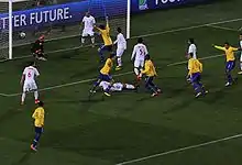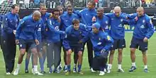 Après les « 3 R » de 2002, le Brésil s'appuie pour la Coupe du monde 2006 sur un « quatuor magique » Ronaldinho-Kaká-Ronaldo-Adriano[99]. Usé par une saison très chargée, Ronaldinho est loin de sa meilleure forme. Pourtant la Seleção s'impose dans son groupe avec facilité, grâce à trois victoires en trois matchs. Qualifiée en huitième de finale, elle écarte sans surprise le Ghana (3-0) et doit affronter en quart la France, portée par un Zinédine Zidane au sommet de son art. Le Brésil offre un spectacle de piètre qualité avec la mise en place d'un jeu défensif. Les Français, solides, l'emportent logiquement, grâce à un but de Thierry Henry qui profite du mauvais placement défensif sur un coup franc de Zidane[100]. Cette défaite attise de nombreuses critiques et de grandes déceptions.