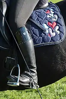 Les bottes sont, après le casque, le second élément indispensable, car elles permettent d'éviter des douleurs liées au frottement de la jambe sur les étrivières[26],[41]. Il est possible de monter à cheval avec une paire de bottes basiques en caoutchouc, mais la plupart des pratiquants réguliers acquièrent des bottes d'équitation, plus confortables, ou bien des bottines, qui ont l'avantage de pouvoir aussi être portées pendant des sorties en ville[26]. Des chaps ou des mini-chaps, protections du bas de la jambe en cuir ou en toile huilée, peuvent remplacer les bottes[42]. Elles sont adaptés aux pratiques de randonnée à cheval et à toute équitation qui implique de passer de longues heures en selle[43]. Les chaussures à éviter sont les chaussures de sport, qui peuvent se coincer dans les étriers[42].