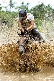 Pratiquer l'équitation implique de porter ou d'acquérir certains équipements[26]. Il existe des spécificités dans ce matériel en fonction de la discipline équestre pratiquée[27]. Hors équitation proprement dite, du matériel d'écurie est nécessaire pour assurer les soins des équidés, en particulier le pansage et l'entretien des pieds[28].