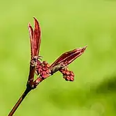 L’érable palmé possède une inflorescence de type corymbe qui fait 3 à 4 centimètres et qui est composée de 10 à 20 fleurs. Celles-ci apparaissent en même temps que les feuilles[4]. Les fleurs sont composées de 5 sépales rouge-pourpre et de 5 pétales allant du jaune pâle au blanc rosâtre. Ceux-ci sont plus petits que les sépales qui mesurent en moyenne 3 mm. La plante possède des fleurs mâles et des fleurs femelles, elle est donc monoïque.