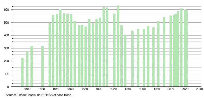 L'évolution du nombre d'habitants est connue à travers les recensements de la population effectués dans la commune depuis 1793. Pour les communes de moins de 10 000 habitants, une enquête de recensement portant sur toute la population est réalisée tous les cinq ans, les populations légales des années intermédiaires étant quant à elles estimées par interpolation ou extrapolation[26]. Pour la commune, le premier recensement exhaustif entrant dans le cadre du nouveau dispositif a été réalisé en 2004[27].