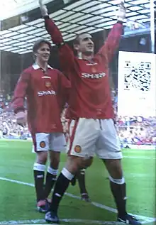 Malgré cette entame en fanfare à l'occasion du Charity Shield, ses rapports avec ses dirigeants se dégradent rapidement et l'histoire avec Leeds ne dure pas. Le il est transféré à Manchester United pour 1,2 million de livres sterling[73]. Dès la première saison avec les Red Devils, Éric Cantona réalise une saison exceptionnelle et remporte son deuxième titre de champion d'Angleterre de suite, devenant le premier joueur du championnat à être successivement champion avec deux clubs différents[73]. Il permet ainsi à Manchester United de remporter son premier titre depuis 26 ans. Pour Ryan Giggs, « Quand il était sur le terrain, même les choses les plus difficiles paraissaient faciles. Avant, nous avions du mal à trouver la faille. Dès qu'il est arrivé, les buts ont commencé à pleuvoir[74]. » Manchester United poursuit sa domination la saison suivante avec un doublé championnat-coupe[73].