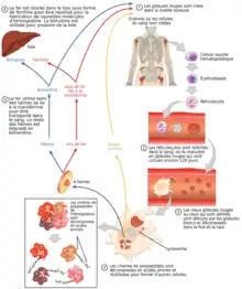 - du fer : Il est stocké dans la moelle osseuse, le foie et la rate dans des protéine appelées ferritine et hémosidérine (la dernière est plus lente à restituer son fer). Quand l'érythropoïétine stimule la production de globules rouges, le fer est lié à la transferrine pour être transporté à la moelle osseuse par le sang ;