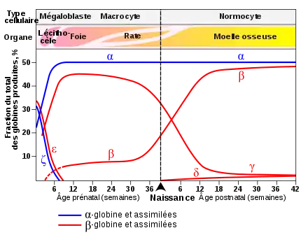 Vers la semaine 4 du développement du fœtus, des cellules souches hématopoïétiques, les cellules génératrices des cellules du sang, dont les globules rouges, se trouvent dans la vésicule vitelline, puis aussi dans le foie de l'embryon vers les semaines 5 à 6. D'autres parties, comme les vaisseaux sanguins principaux et le placenta, renferment aussi quelques cellules souches hématopoïétiques, mais ne sont pas des lieux de développement des cellules sanguines[8]. L'hémoglobine est maintenant principalement composée de chaines α et γ[9].
