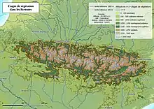 Principaux étages de végétation dans les Pyrénées : mousses et lichens à l'étage nival, prairies à l'étage alpin, pins à crochets à l'étage subalpin, sapins et hêtres à l'étage montagnard puis chênes et châtaigniers à l'étage collinéen.